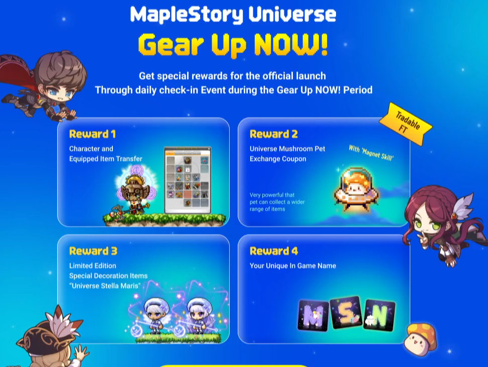 チェックイン回数を規定回数に達し、「Maple Story N Play Quest」を全て達成することで、「装飾アイテム・ペット・キャラクター1人を正式サービスに引き継ぐ権利」を報酬としてもらえるみたいです。